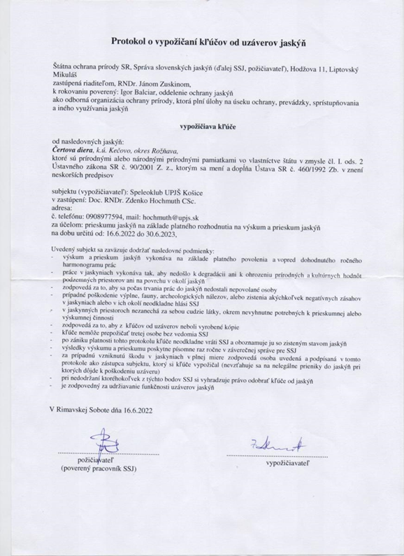 | Objav Hegedüsovej chodby Po odchode časti členov speleoklubu do skupiny ADONIS, pokračovali títo na prieskume na dávnejšie v perspektívnych miestach v systéme. Hlavne v smere za Nebezpečným dómom a tiež v mieste prítoku v Dobrej chodbe. Nakoľko začiatkom roku 2022 bolo obzvlášť suché počasie, sedimenty vypláchnuté po povodni 18. 7.21, úplne vyschol prítok v Dobrej chodbe (je tu stanica MARS) a J. Šupinský a následne členovia Adonis-u objavili rozsiahle pokračovanie západným smerom až do blízkosti ponoru Izolátor. Podpis Š Hegedüsa svedčí o tom, že tieto časti navštívil už v roku 1939 a upadli neskôr do zabudnutia. Teda naše indície a zistené skutočnosti pri pokuse s hydraulickým pulzom (Spravodaj 3, 2016) boli správne. Postup dosiahli tiež v chodbe za Nebezpečným dómom smerom na ponor Hančinej. Priestory dokumentovali lidarom. Výsledný mapu publikovali v Bulletine, vydanom ku kongresu UIS vo Francúzsku. Na základe toho neskôr, počas Speleomítingu SSS 2022 došlo k rokovanius s Predsedom SSS, zástupcom SSJ p.Gažíkom a napokon k súhlasu s trvalým zapožičaním kľúčov od uzáveru Čertovej diery a možnosti priekumu na lokalite 2 subjektami. Hegedusovu chodbu sme zamerali klasickými pomôckami s J. Miklošom v zime r. 2022-23, aby sme presnejšie vedeli smerovať výkopová práce v ponore Izolátor. |