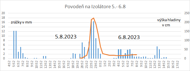 Vysvetlivky: vľavo zrážky v mm v pol hodinových intervaloch, modré stĺpce.